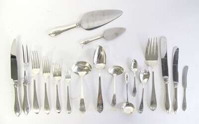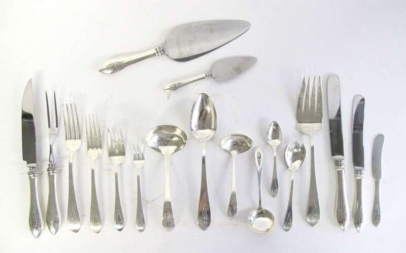 "Broad Antique" pattern, comprising twelve each dinner and luncheon forks, salad and cocktail forks, dinner and luncheon knives, butter spreaders, bouillon spoons, ice cream forks, demitasse spoons; twenty-four teaspoons; three large serving spoons; two small ladles; one each serving fork, ladle, cake server, pastry server, carving fork and knife, monogrammed. (155).
