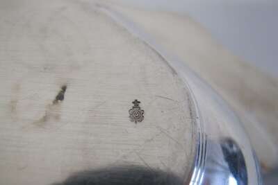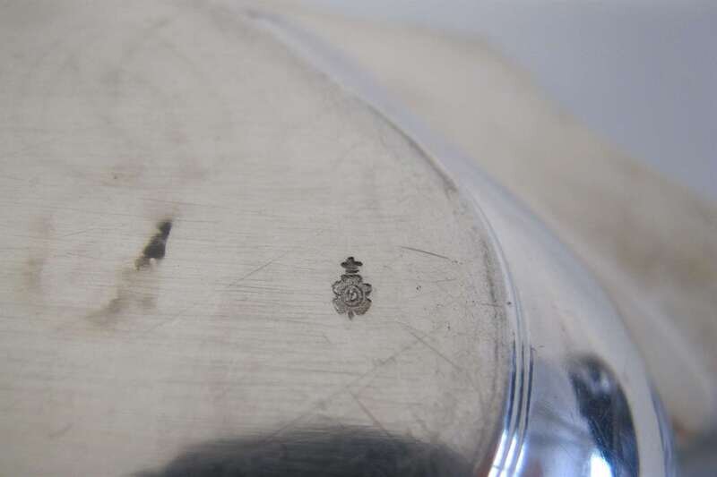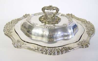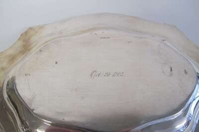 Shaped oval form with applied scroll and floral motif to reeded rim, lid with removable handle and underside with similar floral motif to edge, monogrammed to both dishes, underside engraved "Oct. 28, 1902".
