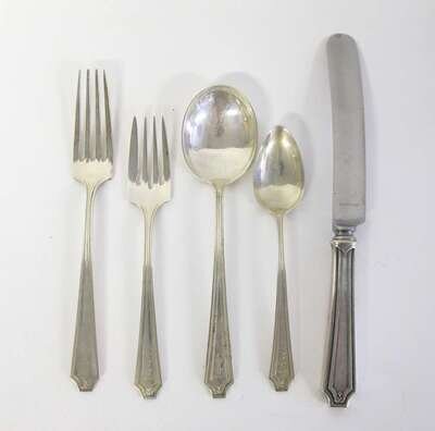 "King Albert" pattern, comprising twelve each dinner knives and forks, salad forks, bouillon spoons, and teaspoons. (60).