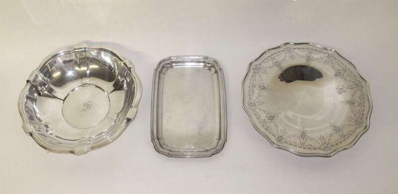 Comprising a Frank M. Whiting Co. pierced footed dish with incised scrolling foliage and floral garlands, monogrammed; a Gorham lobed bowl, monogrammed; and a Fisher shaped rectangular serving dish. (3).