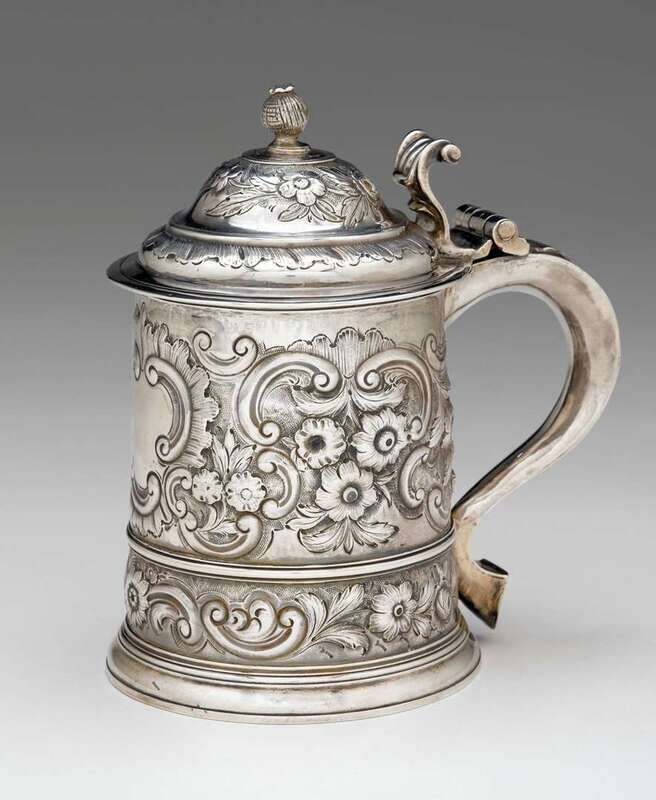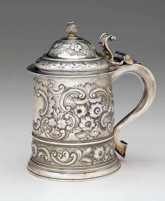 Cylindrical form repoussé-worked to show floral blossoms, foliage, and C-scrolls on a stippled ground, domed cover with scrolling thumbpiece, struck with letter K dating to ?1725.