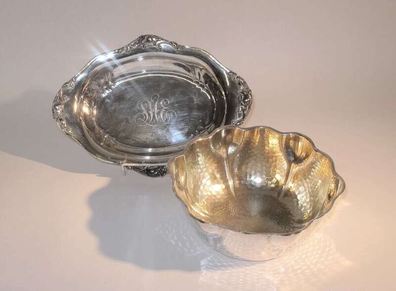 Lobed form bowl with scalloped rim and gilt-washed interior, monogrammed to underside; together with a Dominick & Haff vegetable dish, monogrammed. (2).