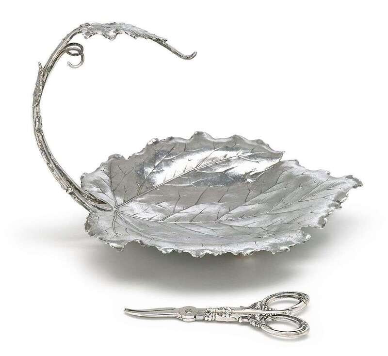Matte finish grape leaf-form footed dish with chased veins and leaves on twig handle to hang grapes; together with a pair of grape shears. (2).