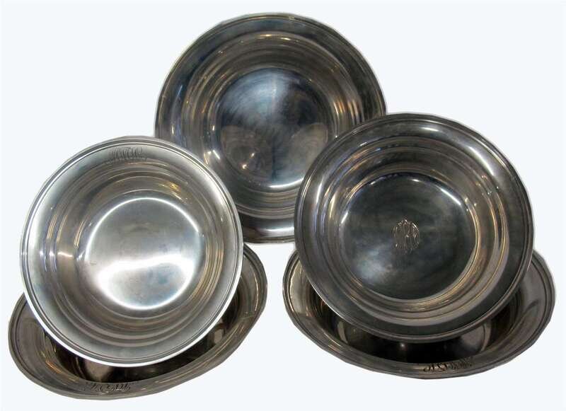 Shallow bowls of typical form and varying sizes, monogrammed. (5).