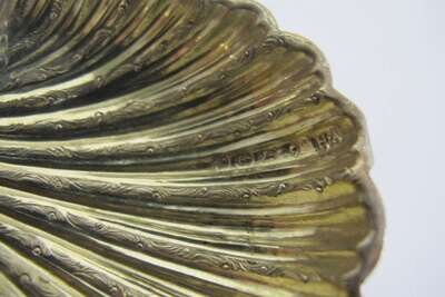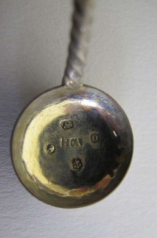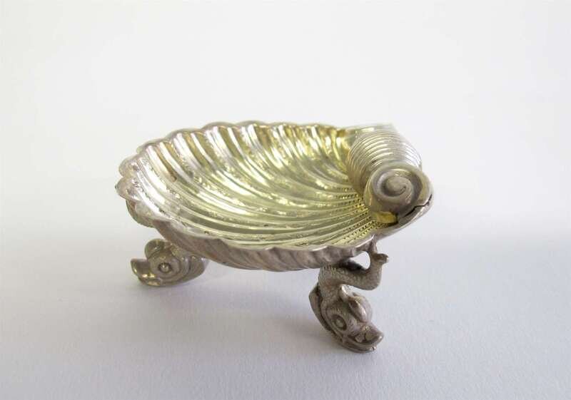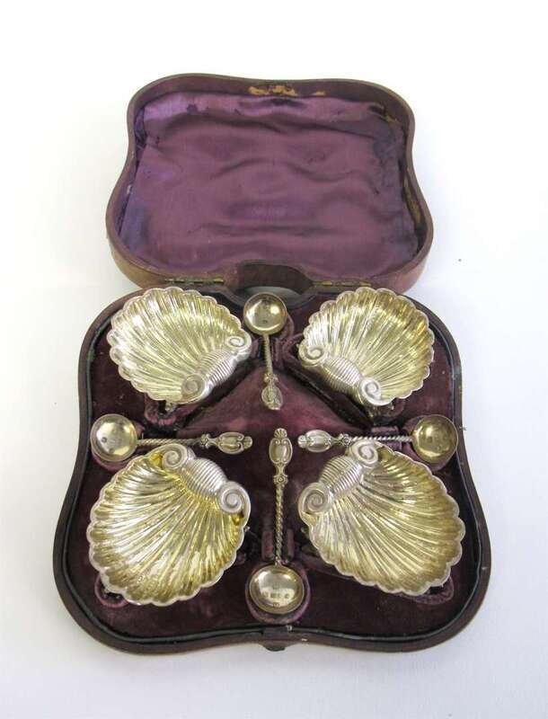 Shell-form salts raised on three dolphin feet, with gilt-washed interior; together with four salt spoons with twisted handles, in original silk lined leather fitted box. (8).
