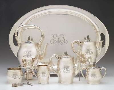 "Paul Revere" pattern, comprising a hot water kettle on stand, coffee and teapot, covered sugar, creamer, wastebowl, and twin-handled tray, baluster form, hinged lid with acorn finial, monogrammed; together with a pair of silver sugar tongs. (8).
