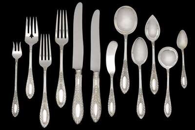 "Gadroonette" pattern, comprising twelve each dinner and luncheon knives, dinner forks, luncheon forks, salad forks, cocktail forks, bouillon spoons, small soup spoons, teaspoons, demitasse spoons; nine butter spreaders; and ten fruit spoons. (145).