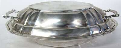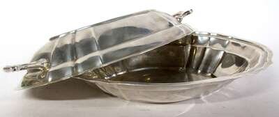 Shaped oval form lobed body, with twin handled cover marked "Sterling" only.