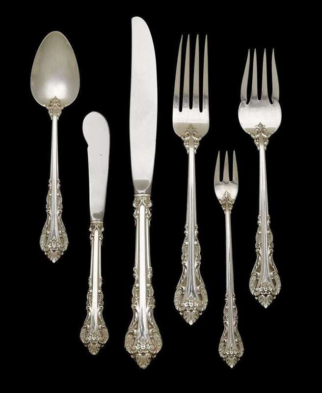 "Masterpiece" pattern, comprising eleven each dinner and butter knives; twelve each dinner, salad, and cocktail forks; and seventeen teaspoons. (75).