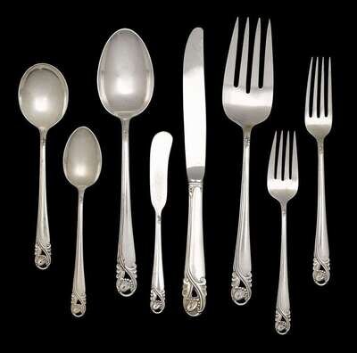 "Spring Glory" pattern, comprising nine each dinner knives and forks, luncheon forks; six butter spreaders; fifteen teaspoons; ten bouillon spoons; one each serving fork and spoon. (60).