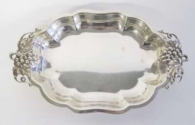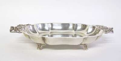 Oval lobed form body with grape and vine twin handles, raised on four scroll feet.