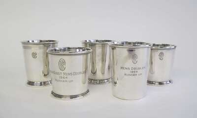 Comprising two Reed and Barton cups with reeded band, one monogrammed; two Baldwin, Miller Co., Inc. cups both engraved for men's doubles runner-ups and monogrammed; and one of plain form with monogram. (5).