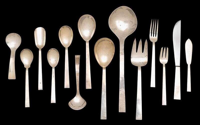 "Moderne" pattern, comprising ten each dinner, luncheon, and salad forks, tablespoons, butter knives; twelve each teaspoons and dinner knives; one each salad serving fork and spoon, gravy ladle, relish scoop, and four serving spoons of various sizes, each stamped "Adra sterling hand worked". (82).