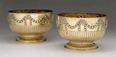 Fluted lower body below repoussé-worked floral swag and flowerheads, raised on fluted circular foot. (2).
