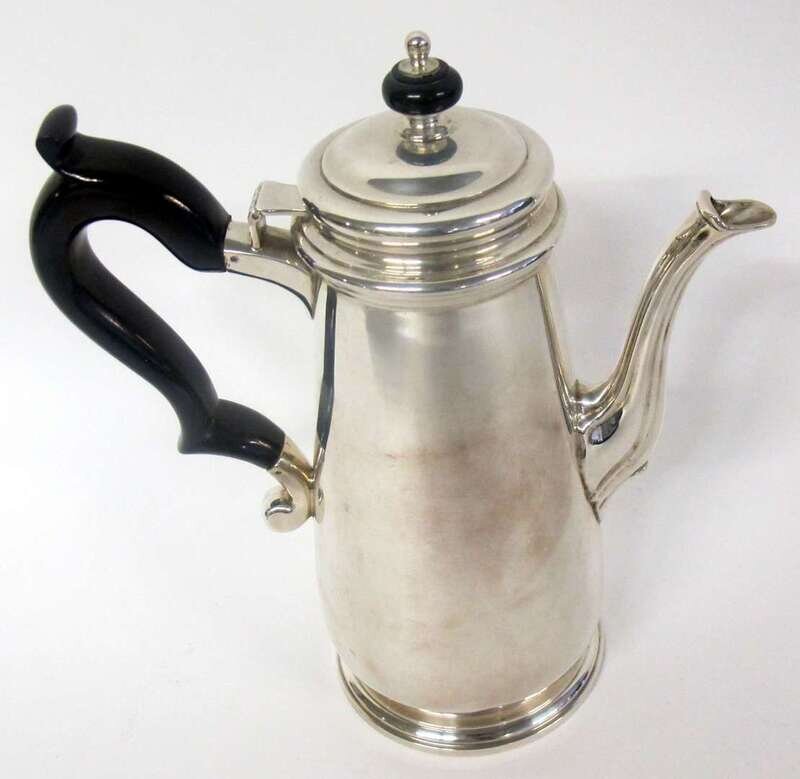 Tapering cylindrical form with reeded spout raised on stepped circular foot, with ebonized wood scroll handle and urn-form finial.
