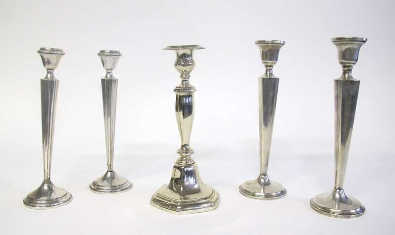 Tapering square-form stem raised on circular foot; together with a pair of candlesticks of slender cylindrical-form marked "Sterling" to base and a single Gorham candlestick, all weighted. (5).