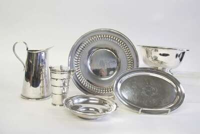 Including a fluted monogrammed dinner plate by Gorham, 1933; an oblong dish engraved "Chesterland Kennel Club 1941" by M. Fred Hirsch Co.; a covered creamer engraved "Robsie" by Gorham; a bowl on stepped circular base; a small dish with scalloped rim; and a water pitcher. (6).
