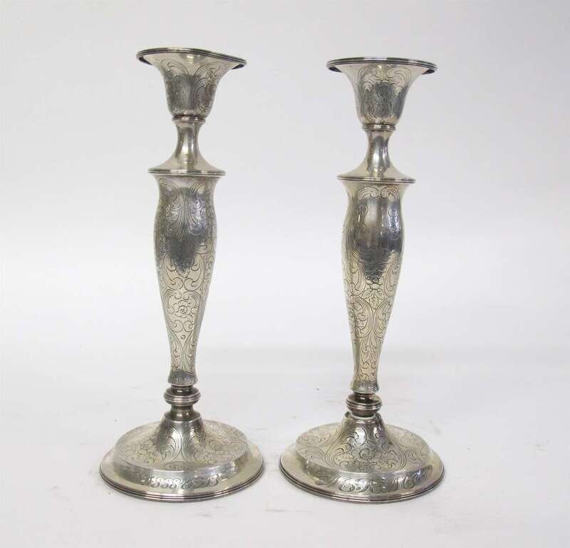 Baluster-form standard on circular base, engraved all over with scrolling foliage and flowerheads, with removable bobeches, monogrammed. (2).