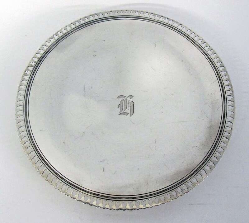 Circular form with beaded and pierced rim, raised on stepped circular foot, monogrammed, makers mark unidentified.