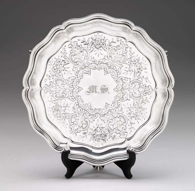 Shaped circular salver chased with florals, foliate, and C-scrolls, monogrammed "M.S." to center within C-scroll cartouche, reverse side engraved "Mary from Aunt Esther Oct. 7, 1903", raised on three ball-and-claw feet.