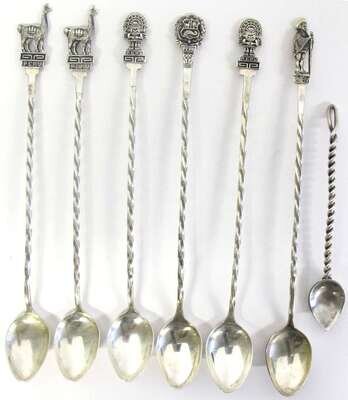 Typical form with applied llama and greek key motif to border; together with six iced tea spoons with twisted stem, one German napkin ring, and two other apparently unmarked napkin rings. (14).