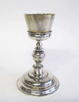 Knopped standard over circular domed base, gilt-washed cylindrical cup, apparently unmarked.