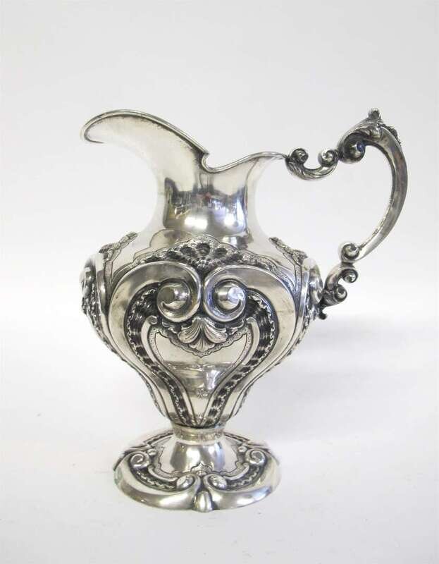 Typical form with bold repoussé and chased scroll and shells, with leaf-capped scroll handle and conforming circular foot, .833 standard.