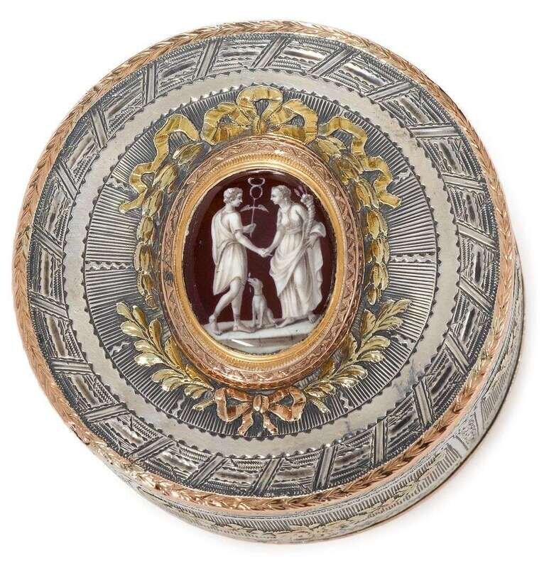 Circular form, the cover inset with a fine oval enamel miniature of classical figures with a cornucopia, a dog is seated between them, surrounded with a rose gold border with yellow and green gold bows, husks and laurel branches, within engraved borders,and chevron engraved rose gold edge, the sides with engraved panels enclosing yellow, rose and green gold floral swags, the underside similarly decorated to the lid, but centered by a rose gold urn issuing flowers and leaves, unscrews to reveal a shallow compartment, underside of cover with small charge mark for Paris 1762-68, maison commune mark crowned B for 1765, and maker's mark AD clearly struck to underside of lid, interior with charge mark and commune mark, maker's mark indistinct.