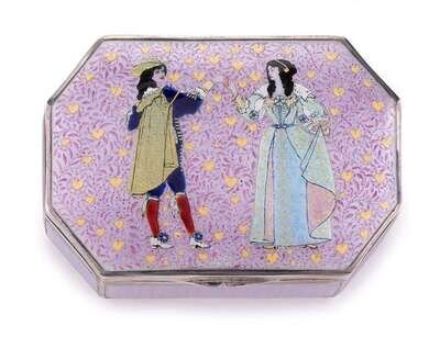 Octagonal form with applied lavender enamel on a engine-turned ground, hinged lid painted with a courting couple in Renaissance-style costume on lavender ground with gold hearts, gilt-washed interior.