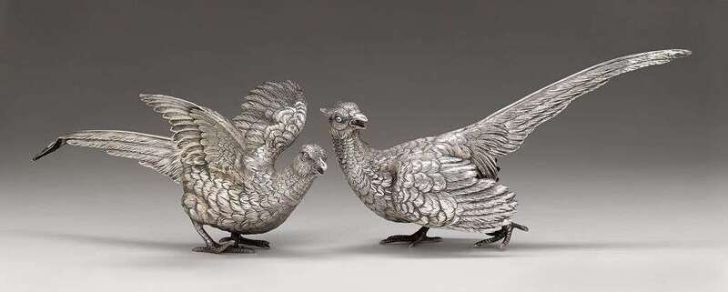 Realistically modelled in the form of pheasants with textured feathers, one with wings raised, the other with tail up and head cocked, stamped "Sterling" and "Germany" to underside along with other indistinct mark. (2).