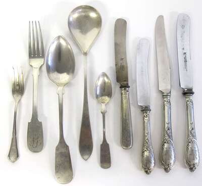Including thirty-two knives, thirteen forks, ten cocktail forks, seven tablespoons, two teaspoons, and a serving spoon, makers include Hugo Sandig, A. Hoff, J.A. Henckels Solingen, and others, some monogrammed. (65).