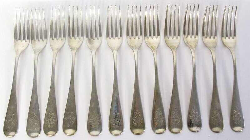 Comprising twelve dinner forks with engraved monogram to terminal, with crescent moon and crown hallmarks, maker's mark unidentified, .800 standard. (12).