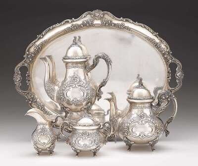 Comprising a coffee and teapot, creamer, sugar, and tray, repoussé worked to show floral and foliage on a stippled ground, body with double C-scroll cartouche with blank reserve, scrolling handles, all raised on four scroll feet. (5).
