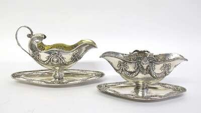 The first by Georg Roth & Co., Hanau, 1891-1919, with repoussé ram's head mask and festoons, on conforming plate with similar motif; the other sauce boat in the form of a nautilus shell with similar garland and ram's head to integral drip tray, with German hallmarks and unidentified maker's mark. (2).