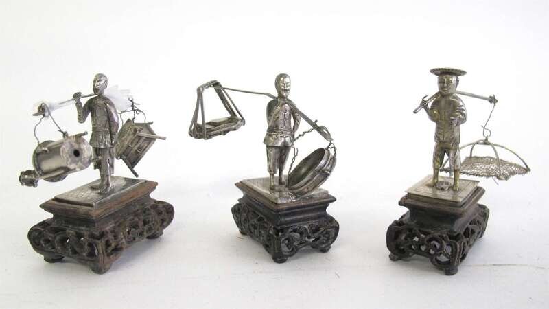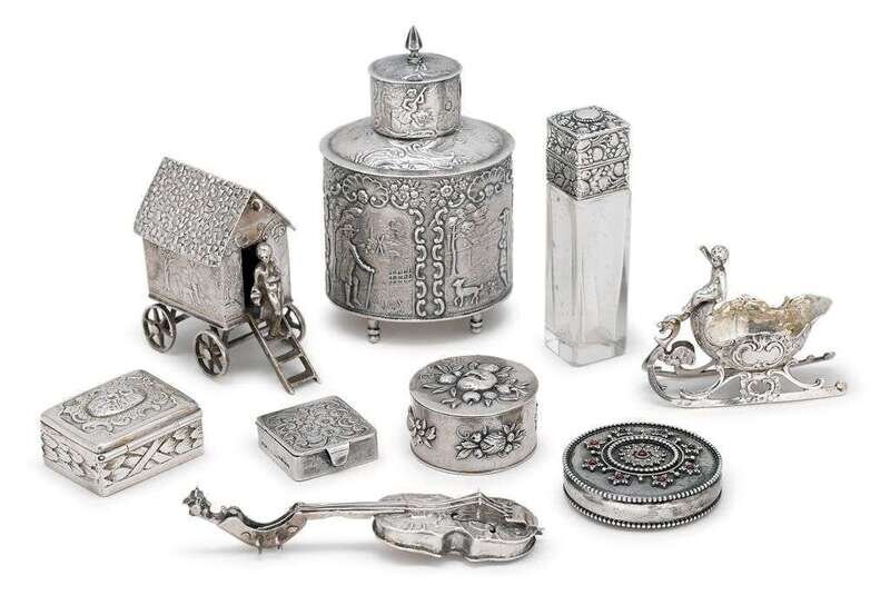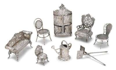Including a sleigh with figure and an openworked and engraved armchair by Stork & Sinsheimer, Hanau; a repoussé floral and scroll pillbox and a corner cabinet with four doors, both stamped with crowned L mark, Hanau; an intricately repoussé-worked and carved sofa; three side chairs; three pill boxes; a violin; a watering can; together with four other miniature pieces and three Chinese merchant figures on wooden bases. (20).