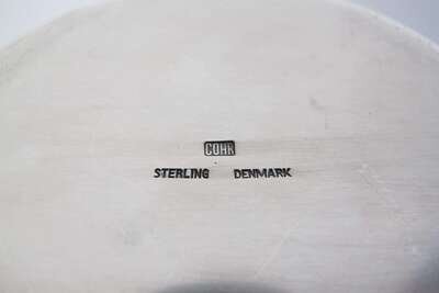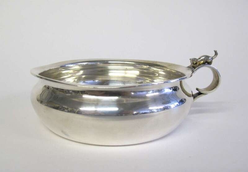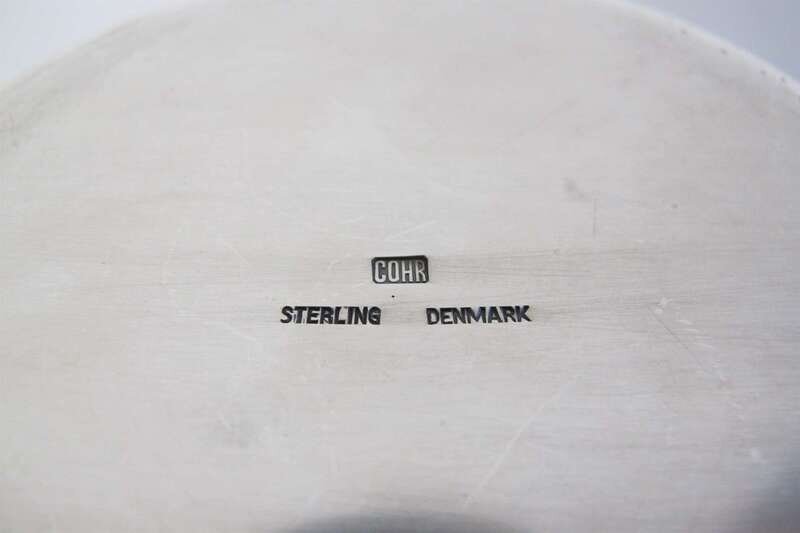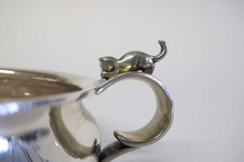 Circular form with single scroll handle surmounted by a cat, underside marked "Cohr", "Denmark", and "Sterling".