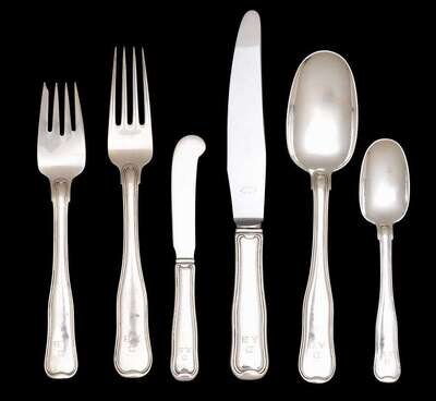"Old Danish" pattern, comprising twelve each dinner knives and forks, salad forks, tablespoons; thirteen each butter knives and teaspoons, monogrammed; together with six continental demitasse spoons. (80).