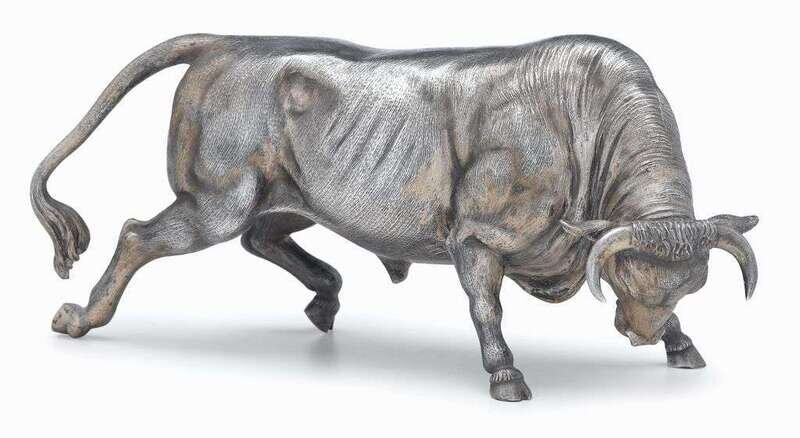 Realistically modelled as a charging bull, the body intricately chased to depict fur, underside of hooves engraved "Buccellati", "Italy Sterling", and the number "10".