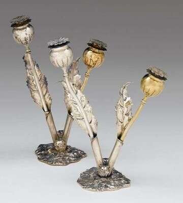 Each realistically modelled as thistle flowers in floral stand, detachable buds pierced for salt or pepper, one flower on each caster gilt-washed. (2).