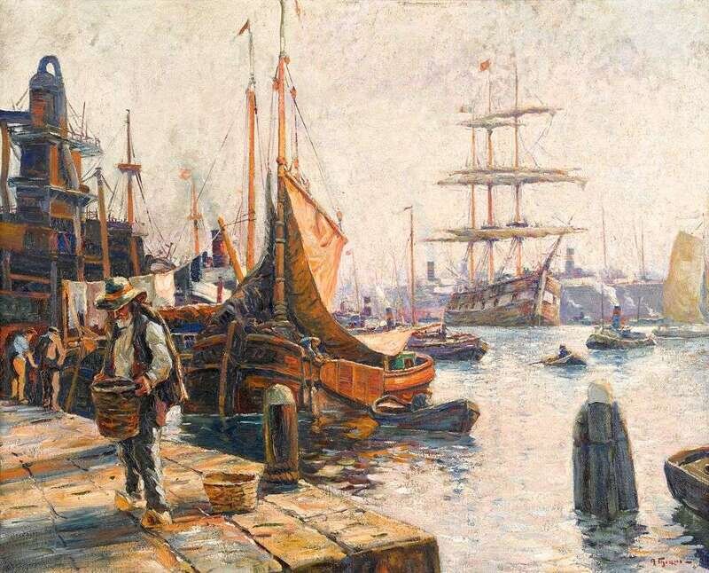 ANTHONY THIEME (AMERICAN 1888-1954) A BUSY HARBOR