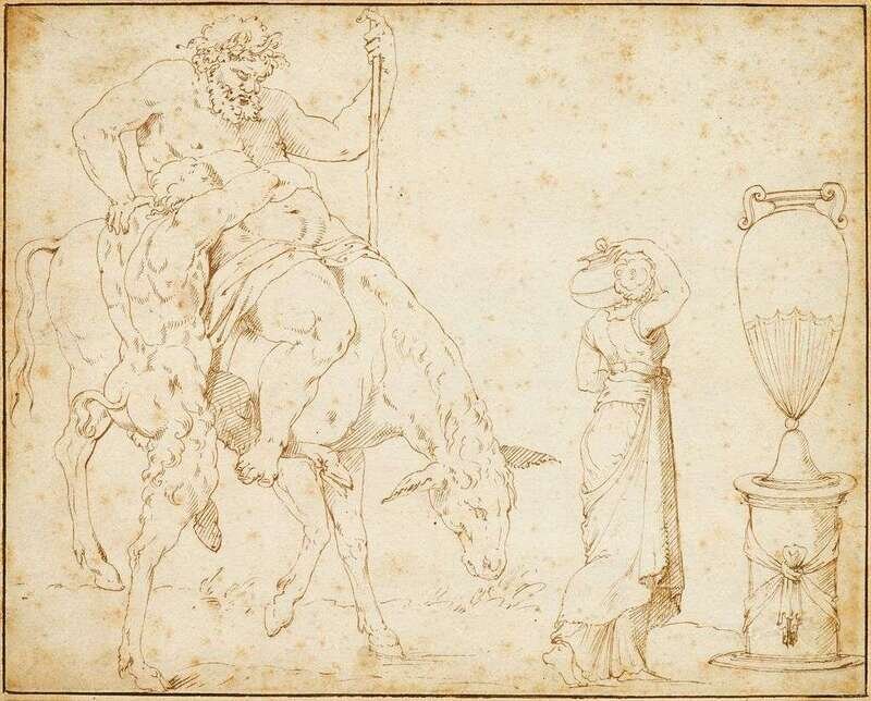 GIROLAMO DA CARPI (ITALIAN 1501-1556) SHEET OF STUDIES: DRUNKEN SILENUS, WOMAN WITH VASE, URN