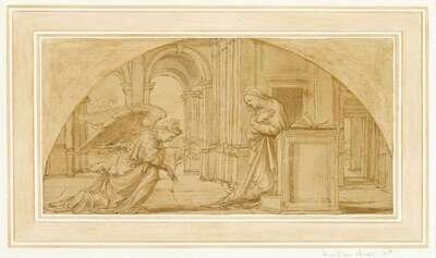 Pen and brown ink with brown washes on paper laid down to card, lunette