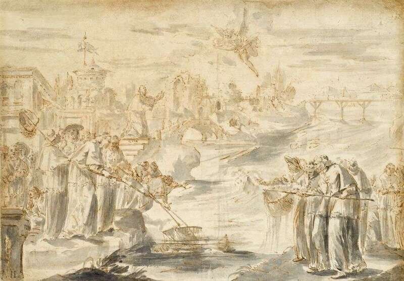 ATTRIBUTED TO PIETRO ANTONIO DE PIETRI (ITALIAN 1663-1716) RIVER SCENE WITH PRELATES FISHING