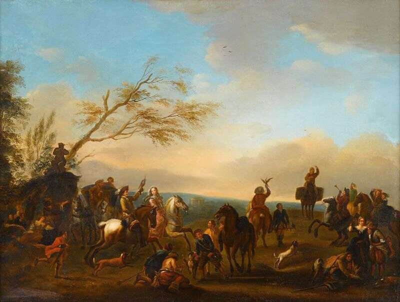 MANNER OF PHILIPS WOUWERMAN (DUTCH 1619-1668) LANDSCAPE WITH FALCONERS AND TOWNSPEOPLE