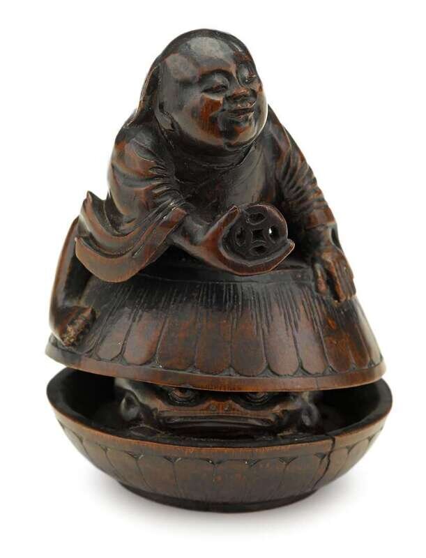 The whimsical carving depicts the immortal Liuhai searching for the three-legged toad, who hides in the box on which Liuhai is leaning.