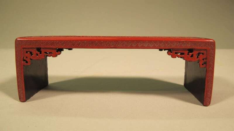 The small and unusual table-form stand intricately decorated to show lotus blossoms over a geometric ground, with openwork spandrels.