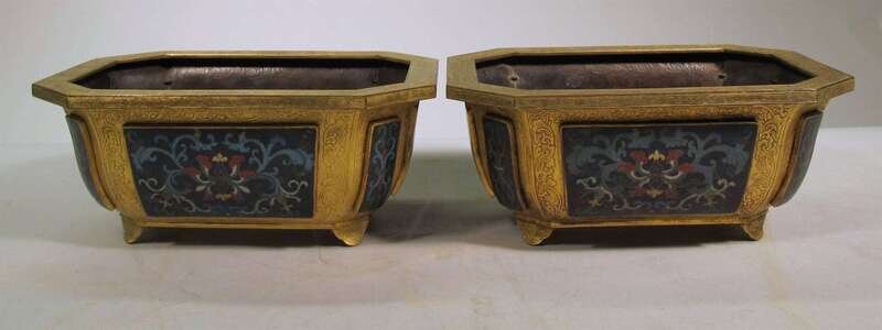 The eight-sided, footed planters elaborately chased with scrolling lotus vines and inset with eight ccloisonné enamel panels showing colorful lotus scrolls over a dark blue ground.
