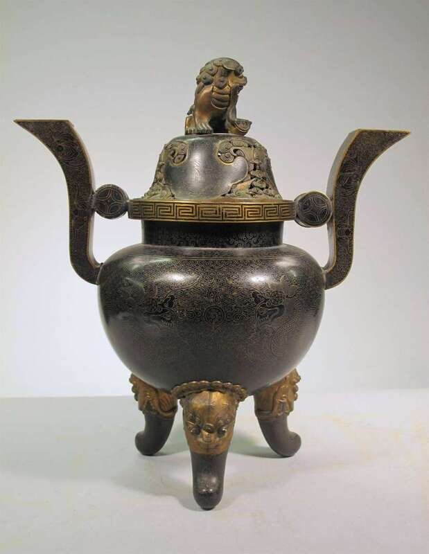 Of globular form raised on beast-headed tripod, enameled throughout with designs of dragons over fiery pearls over ruyi cloud grounds, geometric band over lotus banded neck; mounted by bat designed handles to sides, attached to hollowed bat designed lid; mounted by a fu lion.