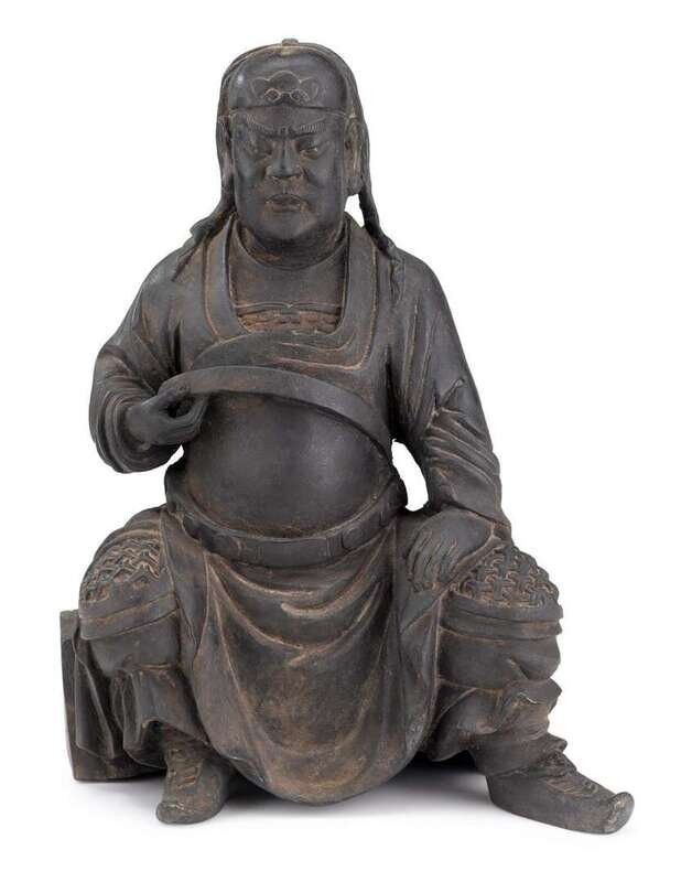 Seated with one hands resting on his thigh and the other lifting up his belt, dressed in simple robe over armory with incised cloud decoration at the knee hems; the face with fierce expression and raised eyebrow, wearing a hat with ruyi designs to front.