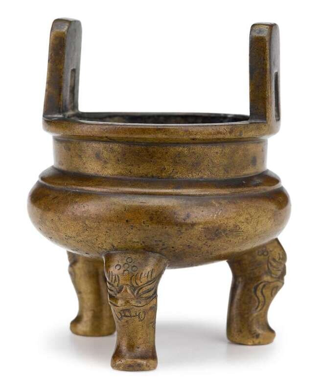 Of compressed globular form connected by two raised handles, mounted on tripod legs with beast head carvings.